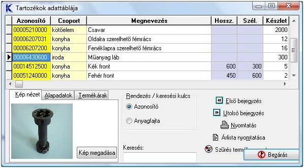 Készletgazdálkodás: A rendszer alkalmas a bútorgyártás és bútorlap szabászat során felhasznált termékek raktári készleteinek követésére. A termékeket és szolgáltatásokat csoportokba sorolva, szállítólevelek és gyártási dokumentumok alapján kezelheti raktárkészleteit. A gyártás során felhasznált anyagok (egész- és maradéktáblák, valamint élzáró anyagok) automatikusan aktualizálásra kerülnek a raktárkészleten. A terméktörzsek adatai Microsoft Excel kompatibilis táblázatokkal kommunikálnak.