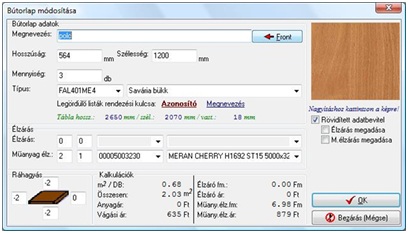 A megrendelés adatainak rögzítésekor a rendszer képes figyelembe venni olyan ofszet értékeket, mint például az anyagráhagyás mértéke, az élzáró anyag, vagy az élzáró előmaró vastagsága.
