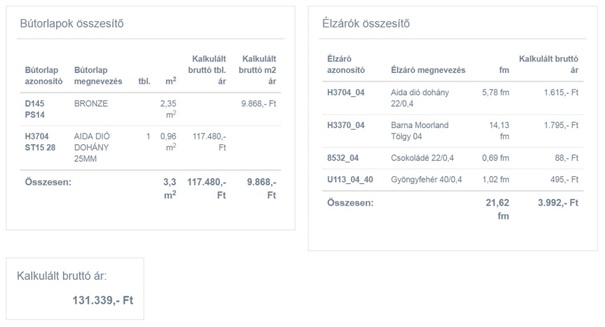 Az összesítő táblázat a tételek alatt folyamatosan frissülve tartalmazza a bútorlapok és élzáró anyagok típusonkénti mennyiségét (m2, tábla, illetve fm mennyiségi egységekben), illetve árat, valamint egy összesített árat.